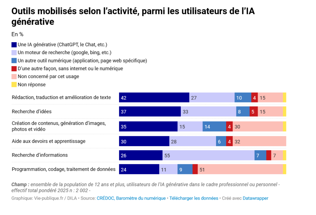 L’étude montre que l’utilisation de l’IA est une pratique personnelle (42% des Français), avant d’être professionnelle (30% des actifs). Le motif d’utilisation est d’abord la recherche d’information (73% des utilisateurs effectuent ce type de requêtes au moins une fois par mois) devant la rédaction, la traduction et l’amélioration de textes (58%) et la recherche de nouvelles idées (57%). Et ChatGPT arrive en première place des agents d’IA (79%), devant Gemini (31%) et Le Chat (14%).