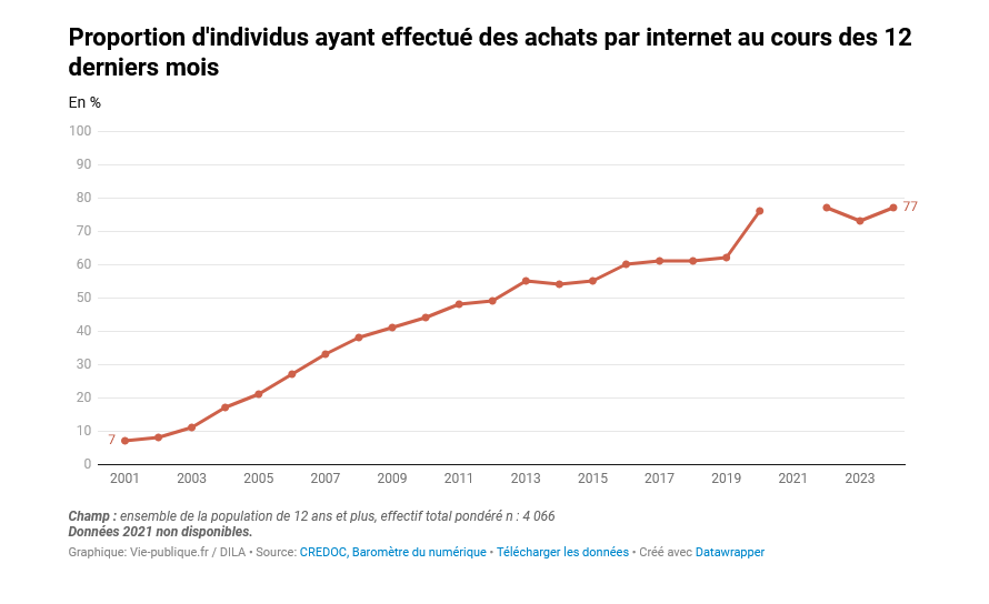 Selon la Cour, en 2024, 94% des Français utilisaient internet, 77% avaient effectué au moins un achat en ligne (contre 7% en 2001) et près de la moitié faisaient au moins un achat en ligne par mois.