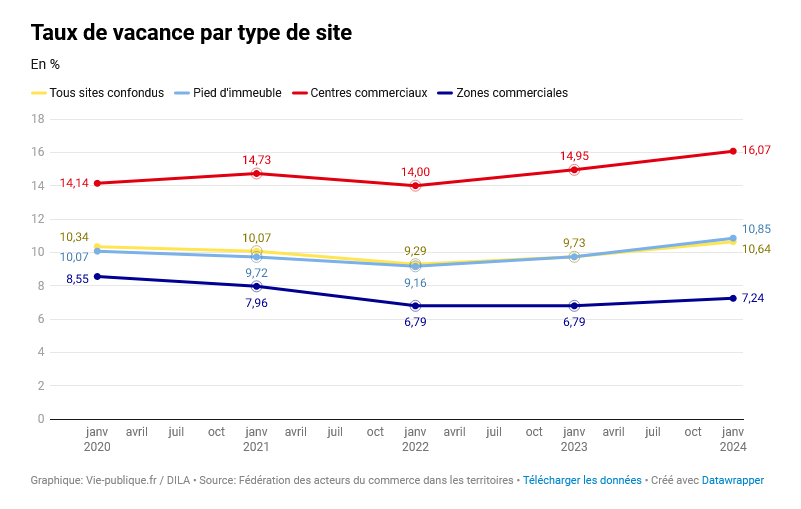 - en raison de l’augmentation des défaillances des entreprises, le taux de vacance commerciale est passé à 14% pour les commerces de centre-ville en 2024. Un chiffre qui a doublé en quinze ans ;