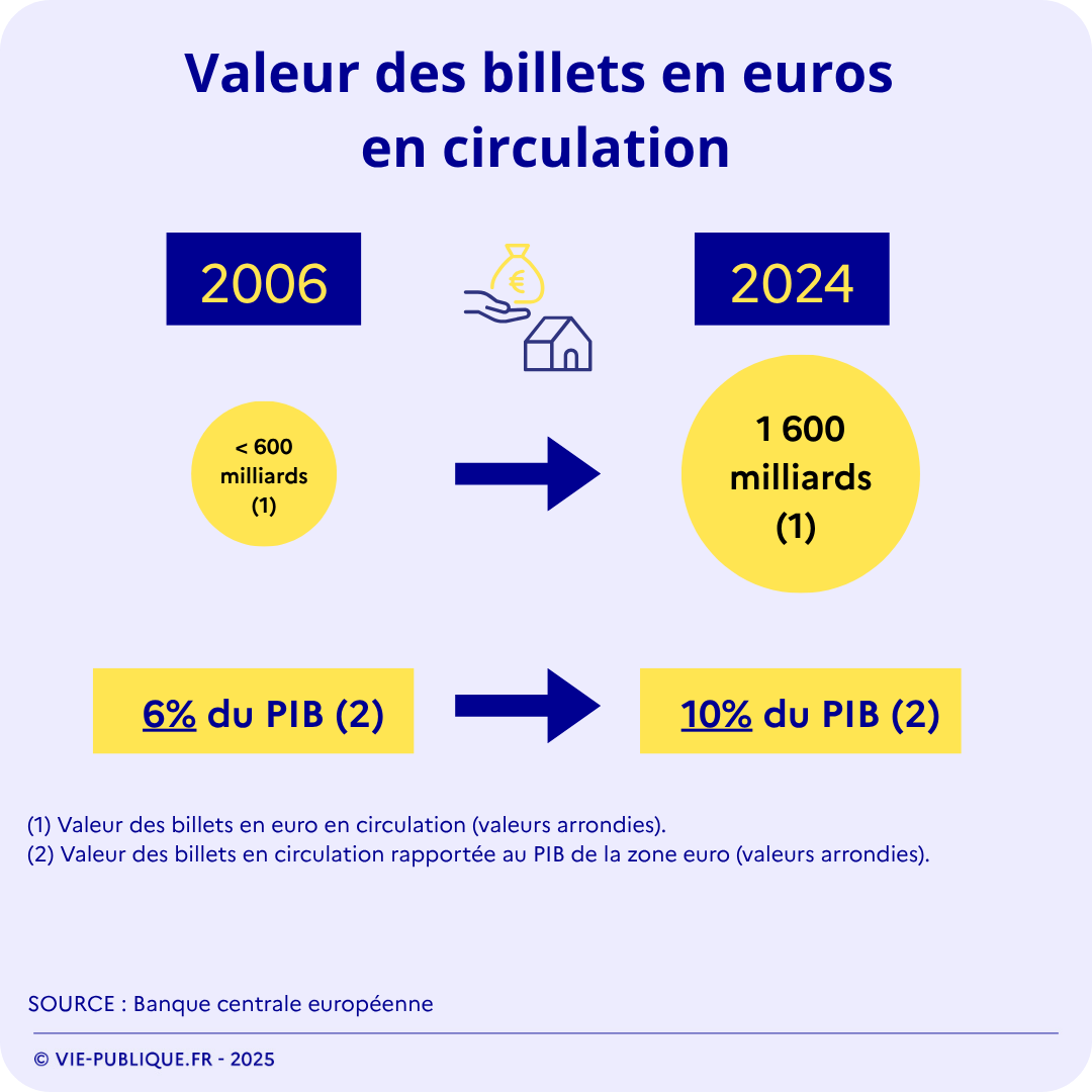 En même temps, la demande globale pour les espèces est très robuste et s’accroît même sur le long terme : la valeur des billets en circulation a presque triplé entre 2005 et 2024 et sa part dans le PIB a augmenté sur vingt ans.