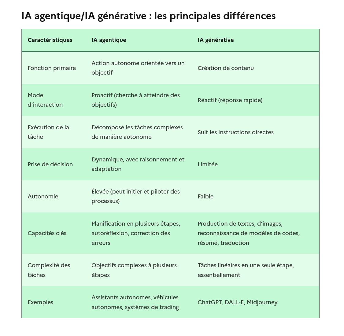 IA agentique/IA générative : les principales différencesCaractéristiquesIA agentiqueIA générativeFonction primaireAction autonome orientée vers un objectifCréation de contenuMode d’interactionProactif (cherche à atteindre des objectifs)Réactif (réponse rapide)Exécution de la tâcheDécompose les tâches complexes de manière autonomeSuit les instructions directesPrise de décisionDynamique, avec raisonnement et adaptationLimitéeAutonomieÉlevée (peut initier et piloter des processus)FaibleCapacités clésPlanification en plusieurs étapes, autoréflexion, correction des erreursProduction de textes, d’images, reconnaissance de modèles de codes, résumé, traductionComplexité des tâchesObjectifs complexes à plusieurs étapesTâches linéaires en une seule étape, essentiellementExemplesAssistants autonomes, véhicules autonomes, systèmes de tradingChatGPT, DALL-E, Midjourney