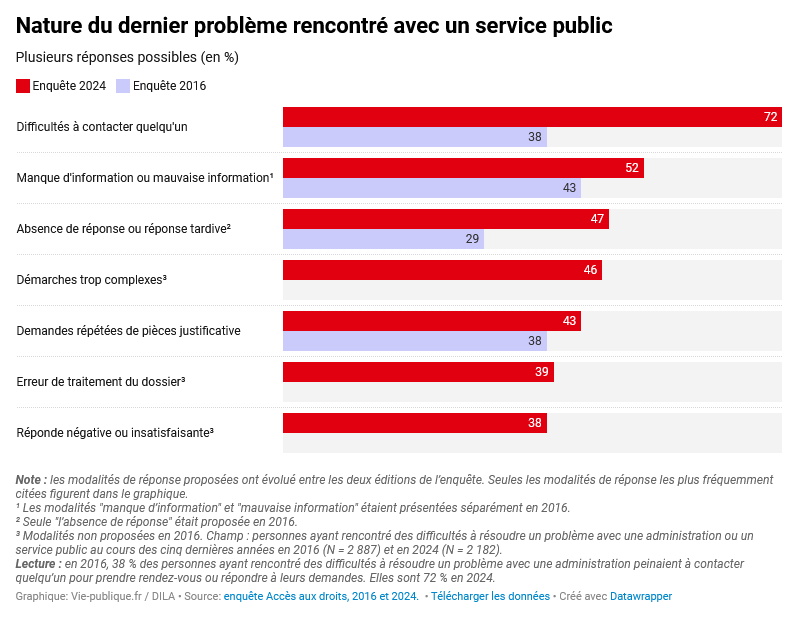 En 2024, 61% des administrés sondés par l’enquête menée par l’institution déclarent rencontrer des difficultés ponctuelles ou régulières (contre seulement 39% des usagers sondés lors de la précédente enquête sur l’accès aux droits, en 2016). Plus de 4 personnes sur 10 déclarent avoir rencontré un problème avec un ou des services publics au cours des cinq dernières années.