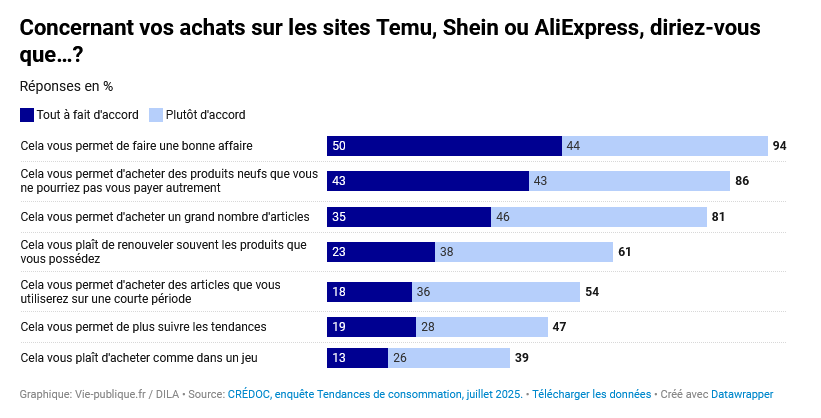 Combien de personnes achètent les produits vendus sur les plateformes d’ultra-fast commerce comme Shein, Temu et AliExpress ? Quelles sont leurs motivations ? Le Crédoc a publié une étude sur l’engouement des consommateurs pour ces marques bon marché qui connaissent une très forte croissance en France.
